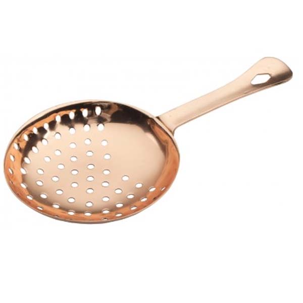 Tämä kuparipinnoitettu Julep-siivilä on suunniteltu helpottamaan sekoituslasista siivilöintiä. Sen kaareva muoto asettuu tukevasti lasin reunalle, mahdollistaen tasaisen ja hallitun kaatamisen.